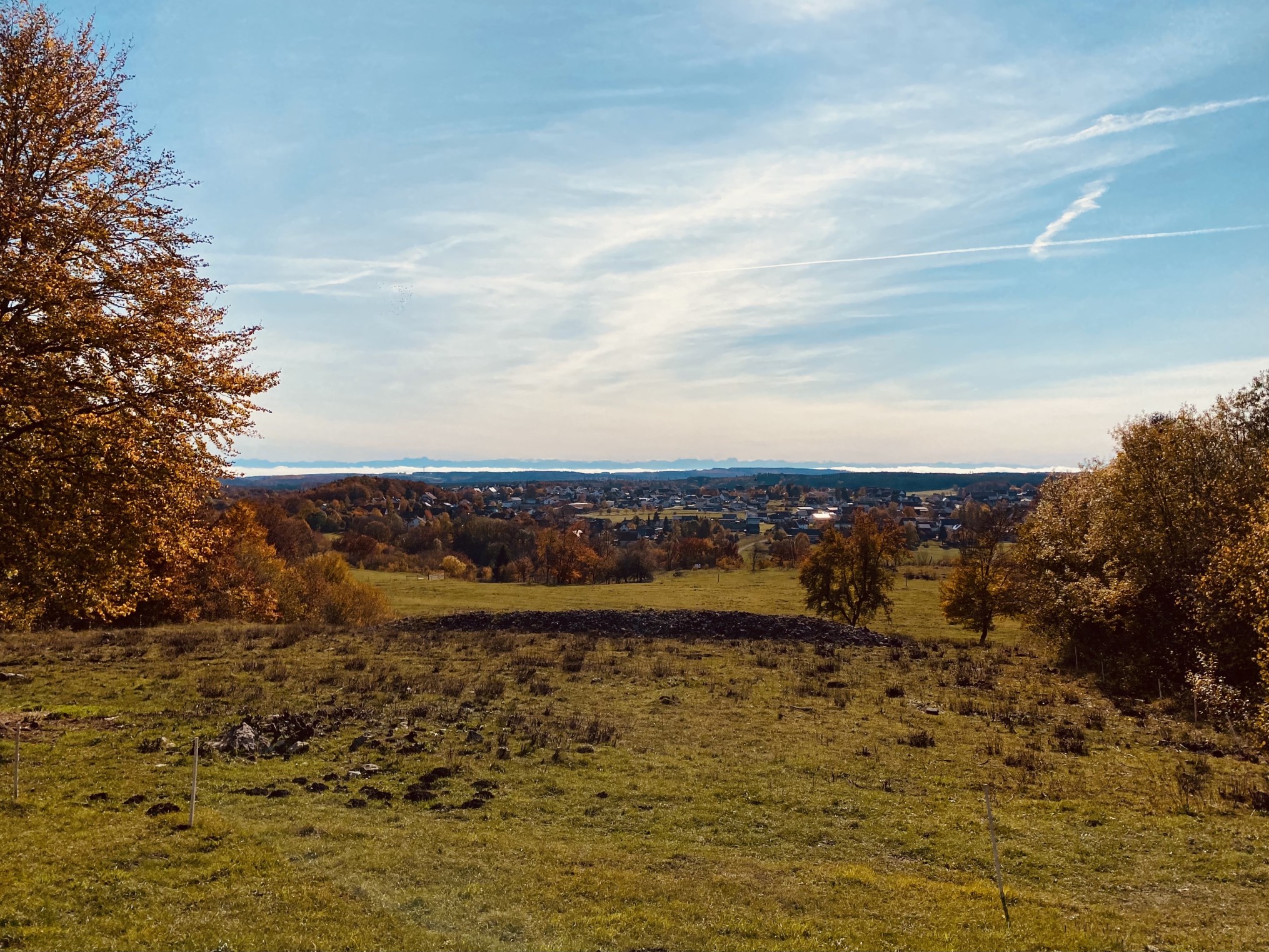Der Blick von der Horenhütte, über Schwenningen, auf das Alpenpanorama.